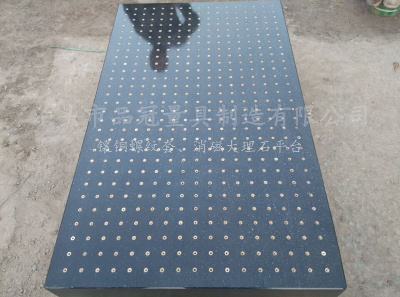 花崗石鑲黃銅螺套平臺是在原有花崗石平臺的基礎(chǔ)上根據(jù)客戶的實際需要打孔(鑲嵌鋼套),開槽;找平行度,平面度,整體的技術(shù)要求要比普通大理石平臺嚴格的多,生產(chǎn)制作工藝與大理石平臺一樣,都是機械加工和手工研磨而成。